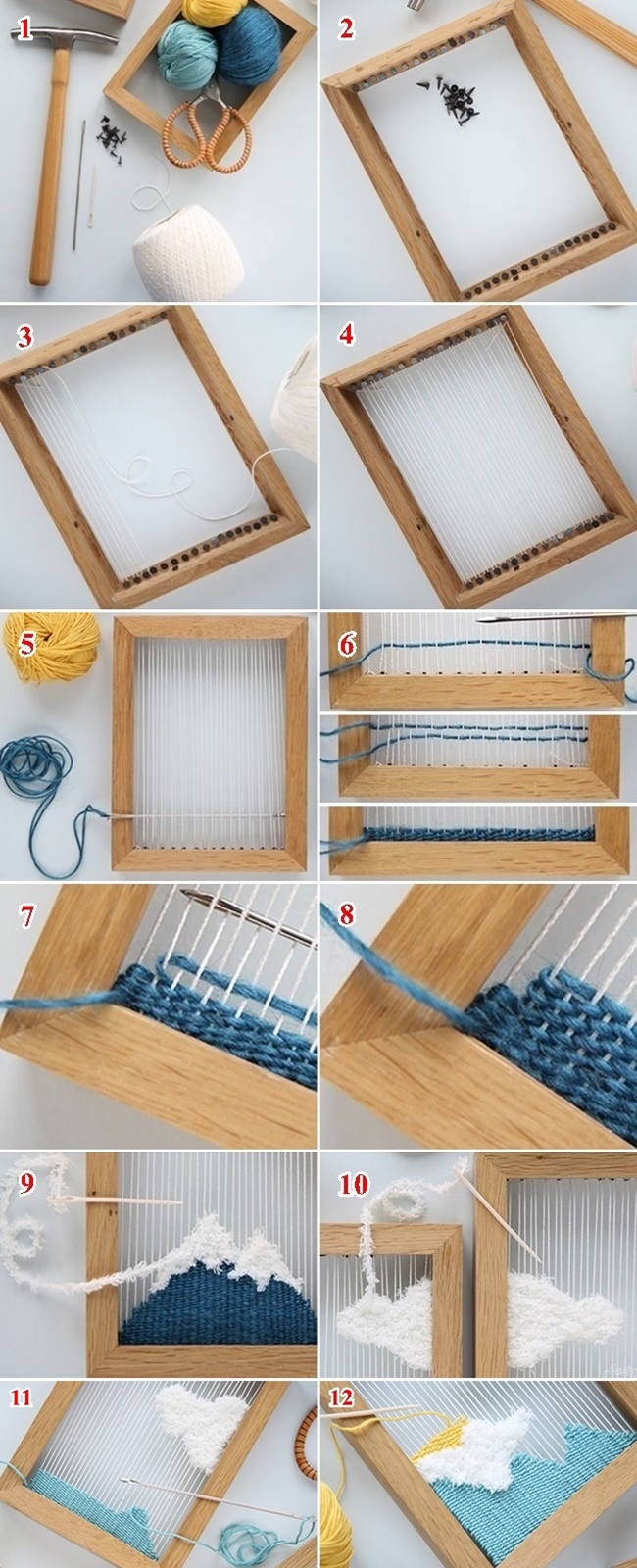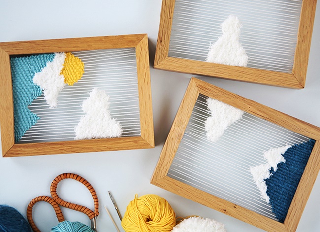 Fehér (bolyhos), sárga, világoskék és sötétkék fonalak, három darab azonos méretű fa képkeret, apró szögek, kalapács és zsákvarrótű szükségesek az alábbi, szövéssel készült fali dekoráció elkészítéséhez. A megvalósítás munkamenete a képsoron lépésről-lépésre követhető.