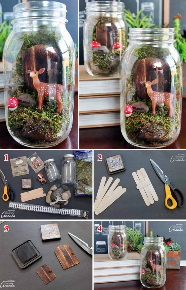 A képsoron látható mini tündérkert elkészítésének kellékei: két tisztára mosott befőttes üveg, szárított moha, spatulák, kavicsok (a gombák is elkészíthetők egymásra ragasztott és megfestett két kisebb kavicsból) és egy kis őzike (kreatív boltban - esetleg játékboltban is - kapható, de kiváltható egyéb állat, vagy manó, tündér figurával is).